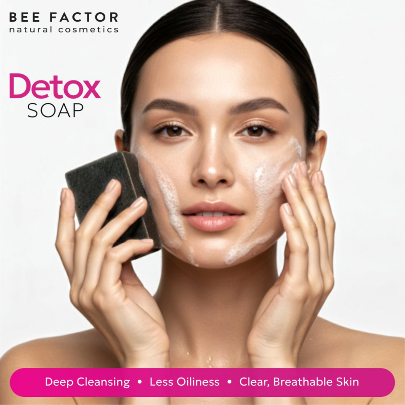 Detox Facial Soap delivers targeted cleansing for oily and acne-prone skin. Activated charcoal acts like a magnet, absorbing excess sebum, impurities and pollutants that clog pores and compromise skin clarity.