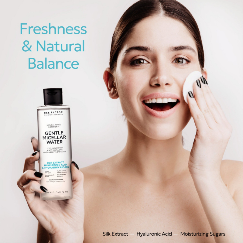 Gentle Micellar Water cleanses and removes makeup with absolute respect for the skin. Micelles capture impurities, makeup and excess oil without rubbing, while the formula hydrates and refreshes the skin, leaving it clean, comfortable and fresh.