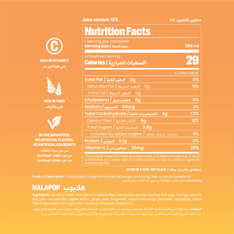 • Ingredients: Sparkling Water, Fiber Blend (Cassava Fiber, topinambur powder, baobab fruit pulp, moringa extract), fruit juice concentrates (apple, lemon, grape, pear, tangerine), natural flavourings (Mandarin, Grapefruit), stevia (steviol glycosides, 150 mg/L), Beta C