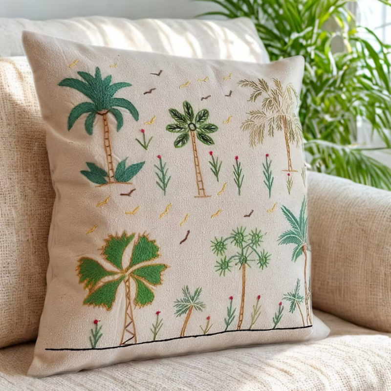 This handmade embroidered cushion cover is part of our Threads of Hope collection - Palm & Ghaf Tree Collection, inspired by the UAE’s iconic native trees, a homeware collection crafted by local Egyptian women artisans using 100% ethically sourced Egyptian cotton. Each piece is carefully made by hand, no two are exactly alike featuring village-inspired embroidery that reflects generations of heritage and skilled craftsmanship.