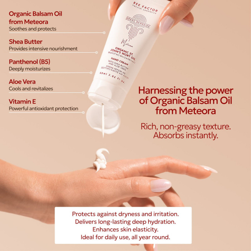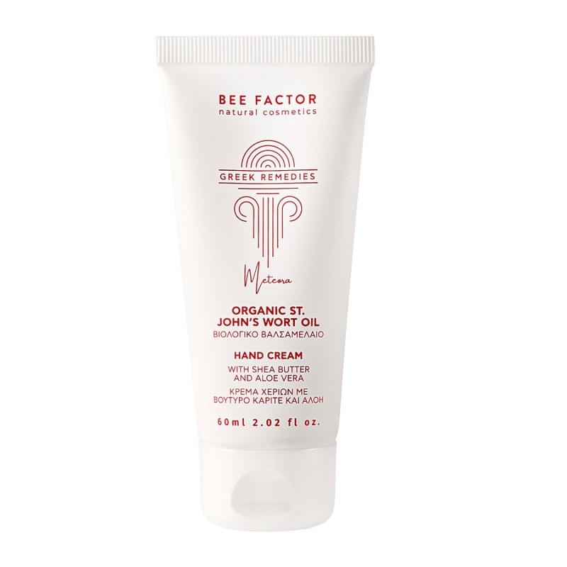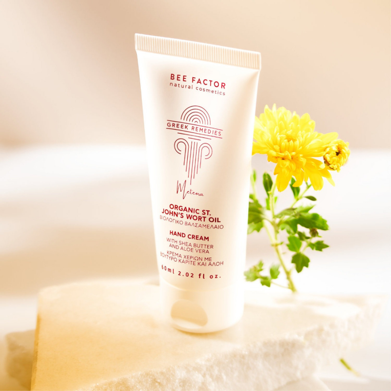 St. John’s Wort Repair Hand Cream draws its strength from Greek nature and the healing tradition of Meteora. At the heart of the formula lies organic St. John’s Wort oil (Hypericum perforatum), known for its soothing and restorative properties.